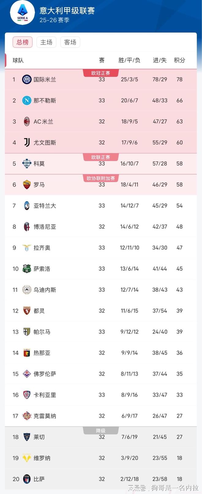 在最新积分榜中,国米33轮积78分,领先第二名的那不勒斯12分。若下轮国米打平,且那不勒斯输球,则国米夺冠;若,国米下轮赢球,那不勒斯不能取分,则国米同样夺冠。此外,根据意甲规则,若赛季结束时积分相同,则需要进行附加赛。