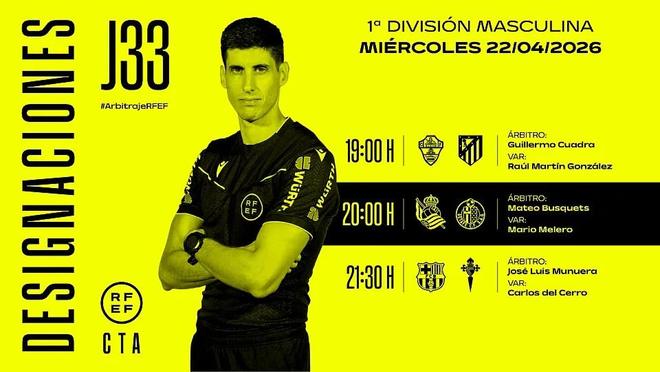 西班牙足协官方公布了本周三西甲比赛的裁判安排,何塞-穆努埃拉将执法巴萨vs塞尔塔。